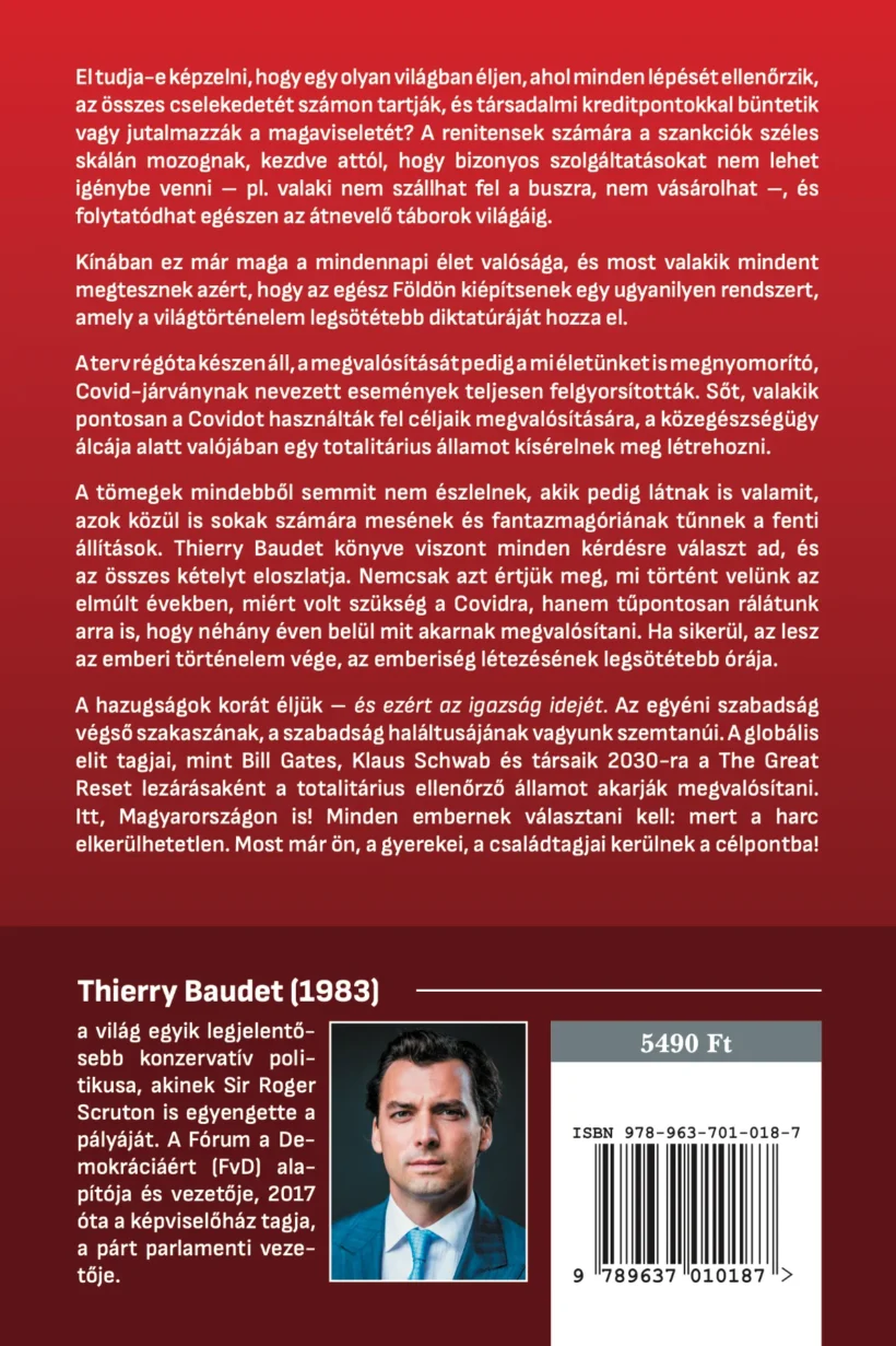 A tömegek mindebből semmit nem észlelnek, akik pedig látnak is valamit, azok közül is sokak számára mesének és fantazmagóriának tűnnek a fenti állítások. Thierry Baudet könyve viszont minden kérdésre választ ad, és az összes kételyt eloszlatja. Nemcsak azt értjük meg, mi történt velünk az elmúlt években, miért volt szükség a Covidra, hanem tűpontosan rálátunk arra is, hogy néhány éven belül mit akarnak megvalósítani. Ha sikerül, az lesz az emberi történelem vége, az emberiség létezésének legsötétebb órája.